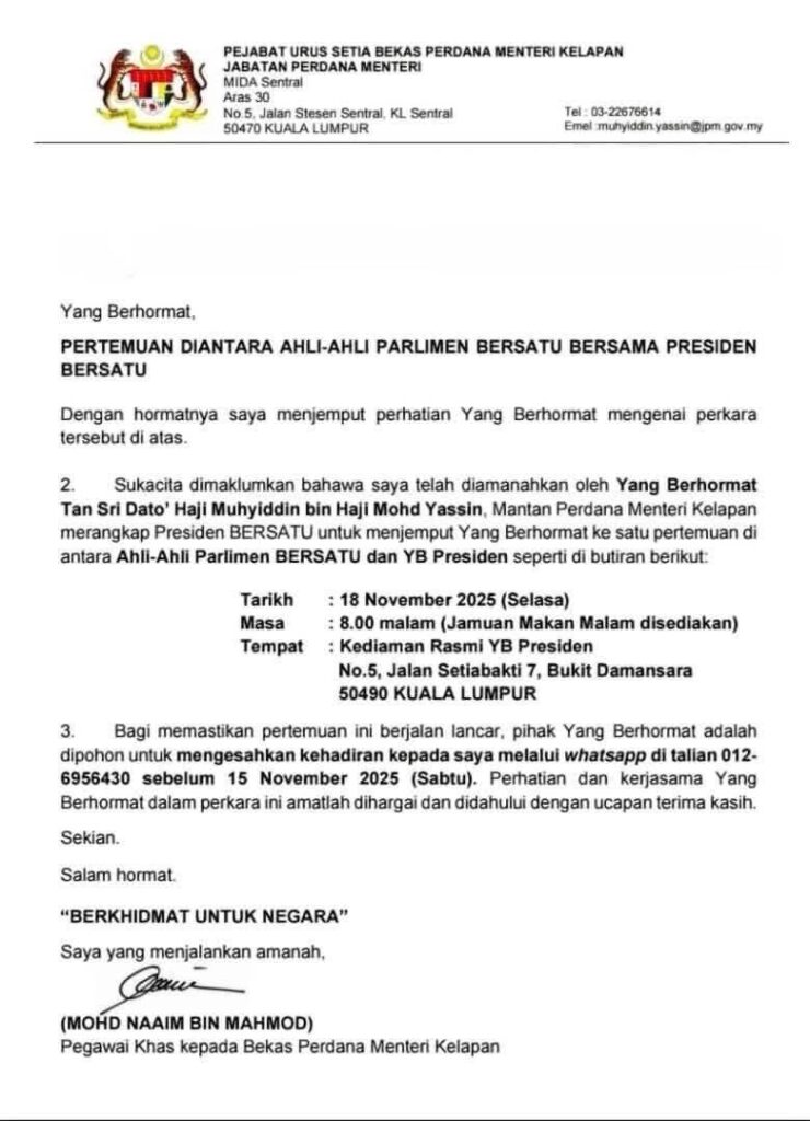 Semua Ahli Parlimen Bersatu dijemput menghadiri pertemuan tersebut dan diminta mengesahkan kehadiran sebelum 15 November (Sabtu).